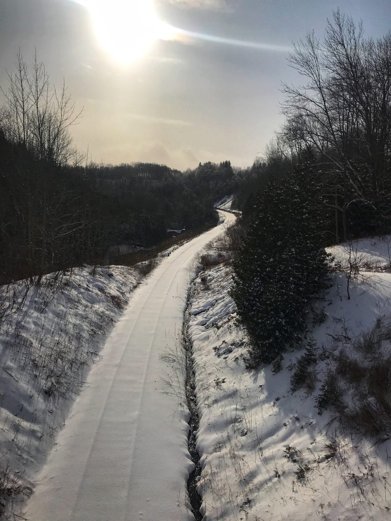 We ventured along a loop made up of the Meadow Trail, Ruins Trail, and Trans Canada Trail. It was a shorter hike, which offered several bridges with scenic views overlooking the railway tracks and the Credit River. A stair case leads you up to the peak of the valley, above the Cataract Falls. Note that availability of the platforms or trails to view the Cataract Falls may change. Check with the Bruce Trail Conservancy for trail updates.