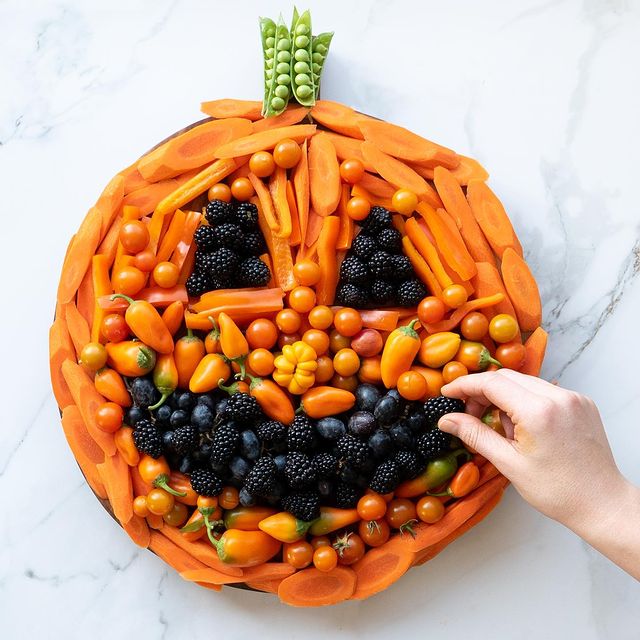 This one is perfect for that circular platter you have at home (and the handle makes a perfect pumpkin stem!). We know this one is lacking in the meat and cheese department so go ahead and add to this fruit and veggie platter by Peas Thank You.
