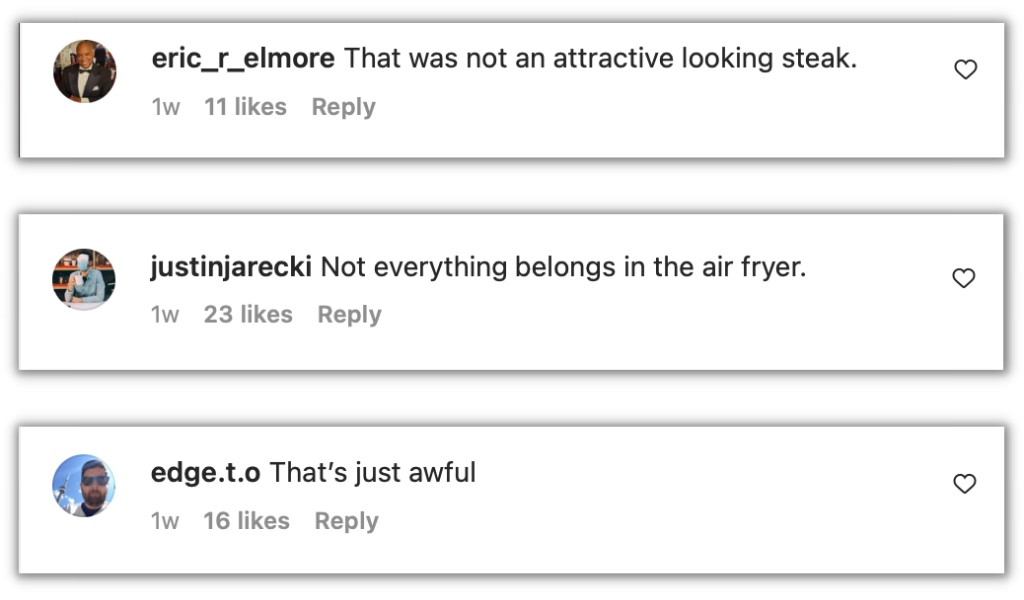 This latest post by America’s Test Kitchen had us cringing. Despite the overwhelming praise America’s Test Kitchen had for air fryer steak, its presentation leaves much to be desired.