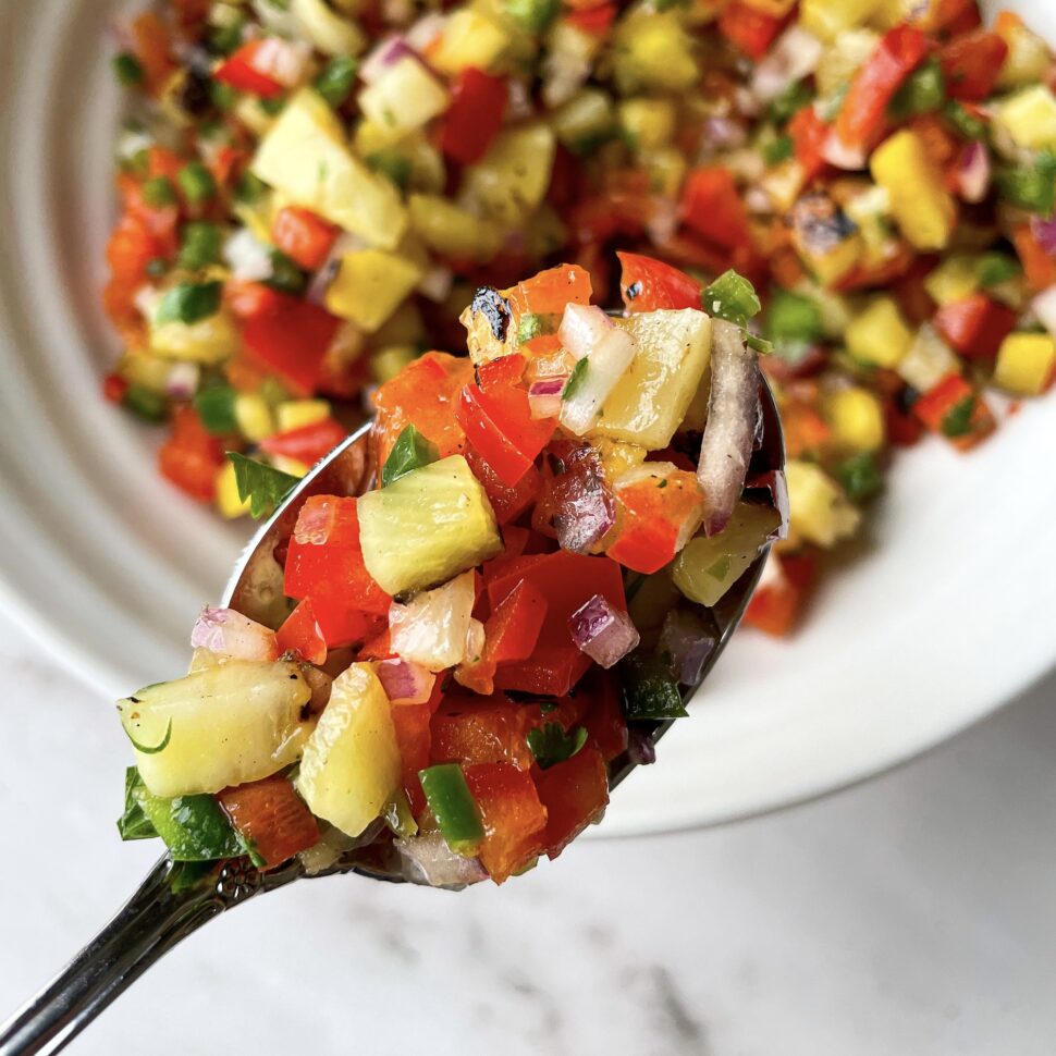 Make the salsa: In a medium bowl, mix together the diced pineapple, red pepper, red onion, jalapeño, cilantro, lime, and olive oil. Season to taste with salt and pepper.
