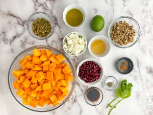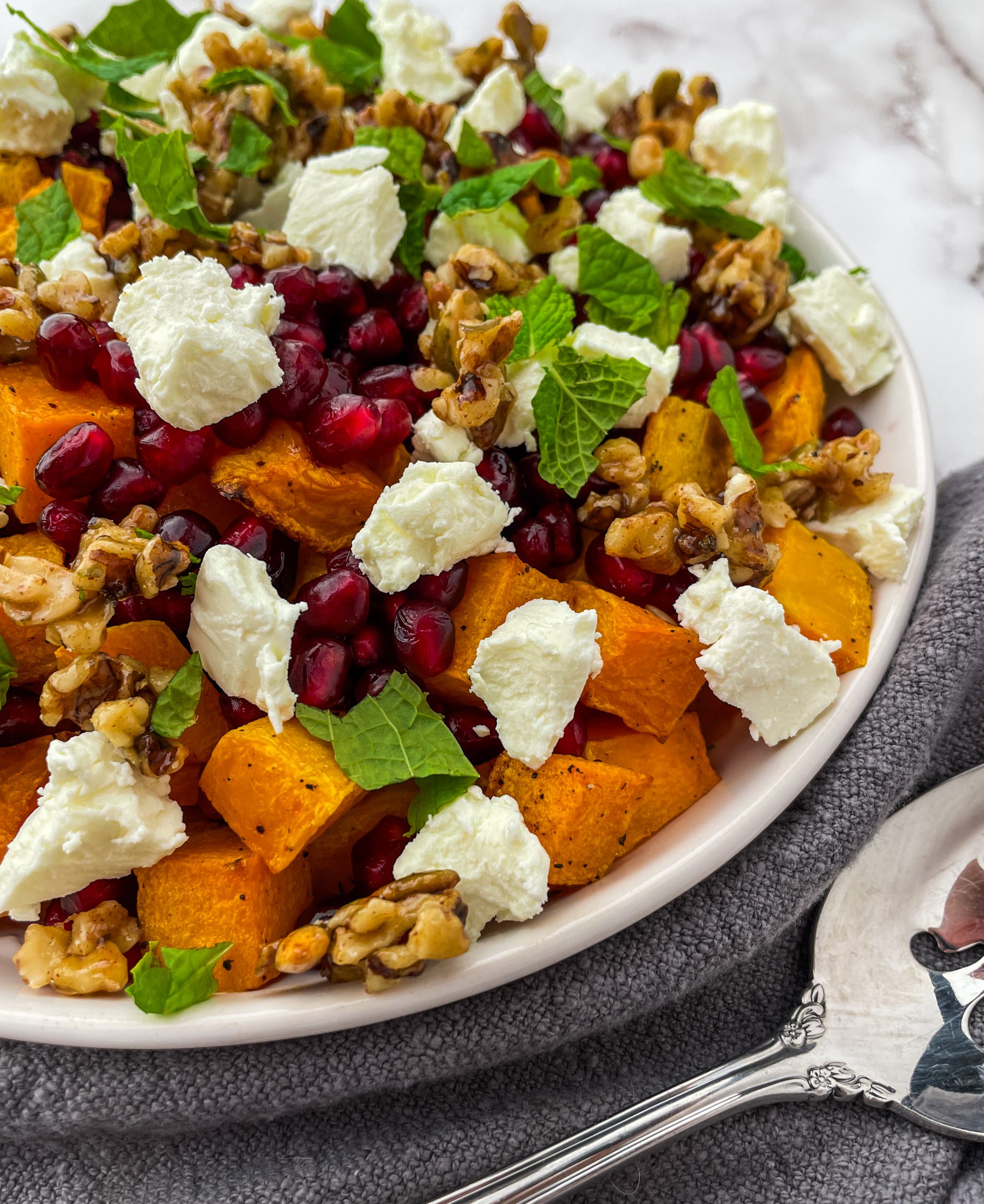 This vibrant and flavorful salad is a delightful medley of sweet and savory, making it the perfect addition to any meal or a satisfying standalone dish. With tender butternut squash, creamy goat cheese, juicy pomegranate arils, and a tantalizing blend of spiced nuts, every bite is a burst of deliciousness.