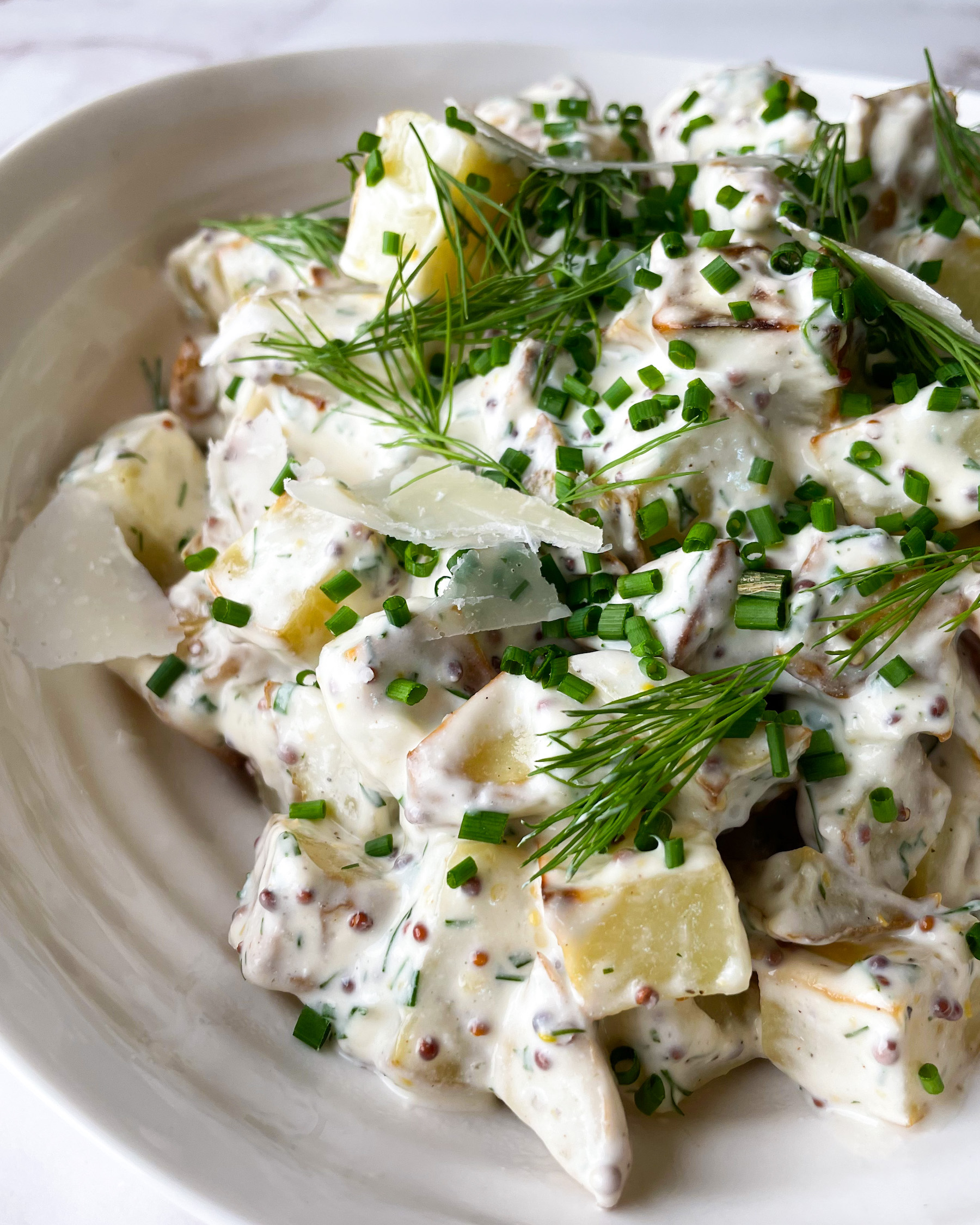 While the potatoes are roasting, make the dressing. In a medium bowl, combine the mayonnaise, sour cream, lemon juice, Dijon mustard, garlic, parmesan cheese, dill, chive, sea salt and black pepper.